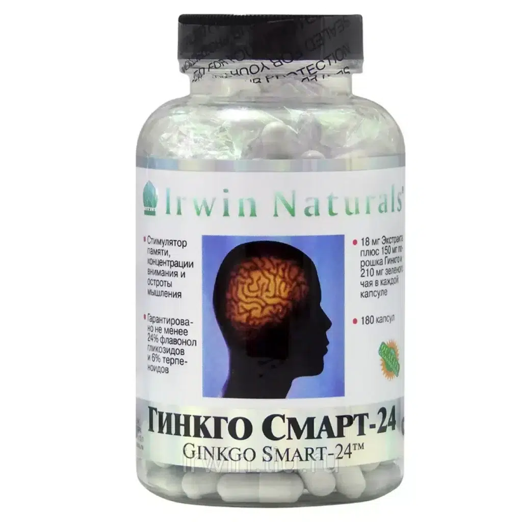 Irwin Naturals Ginkgo brain supplement tablets, 180 tablets, made in Russia.Uses of Irwin Naturals Ginkgo Brain Supplement: Strongly stimulates memory, concentration, and mental sharpness; Slows down brain aging; Reduces the risk of heart attack, stroke, and their complications; Strengthens blood vessel walls and improves blood circulation; Normalizes blood pressure; Reduces cholesterol; Improves vision and hearing; Improves skin condition and appearance; Reduces symptoms of depression; Effectiveness and safety have been confirmed by clinical trials. Instructions for use: Take 2 tablets daily, divided into 2 doses, after meals. Long-term (or regular) use is recommended for best results. Contraindications: Individual intolerance to the ingredients, children under 14 years of age, pregnant and breastfeeding women.